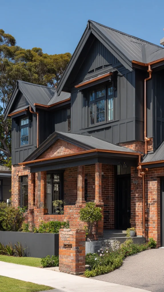 Charcoal grey with warm red brick detailing and copper guttering, downpipes, or light fixtures creates one of the most materially rich exterior schemes available. Fresh copper against charcoal grey is spectacular. aged verdigris copper is extraordinary. Copper accents can be introduced gradually beginning with a single light fixture and expanded over time as budget allows.