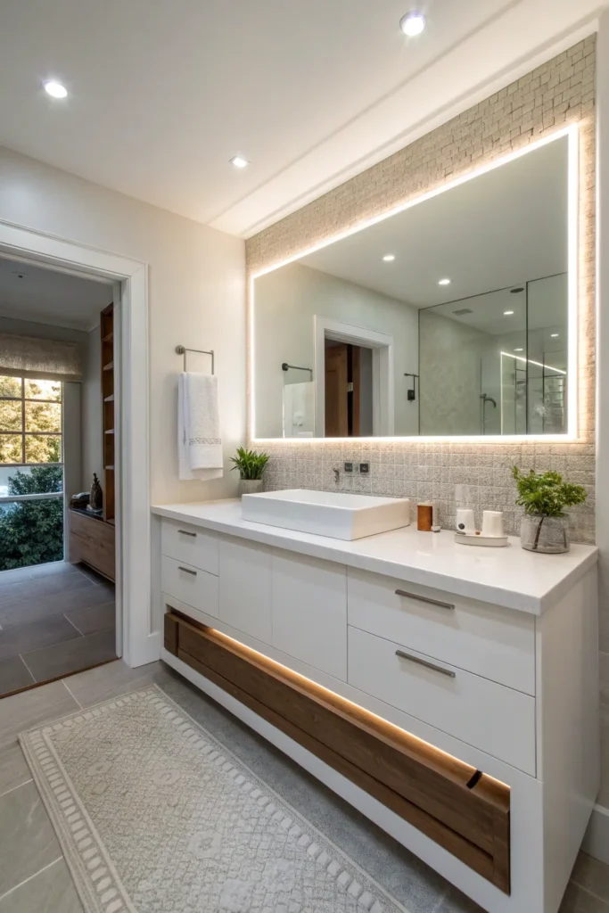 Go for minimal hardware and soft LED mirror lighting to keep the look seamless. Stick to slim faucets for a clean, modern finish.