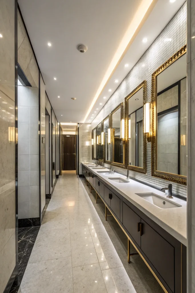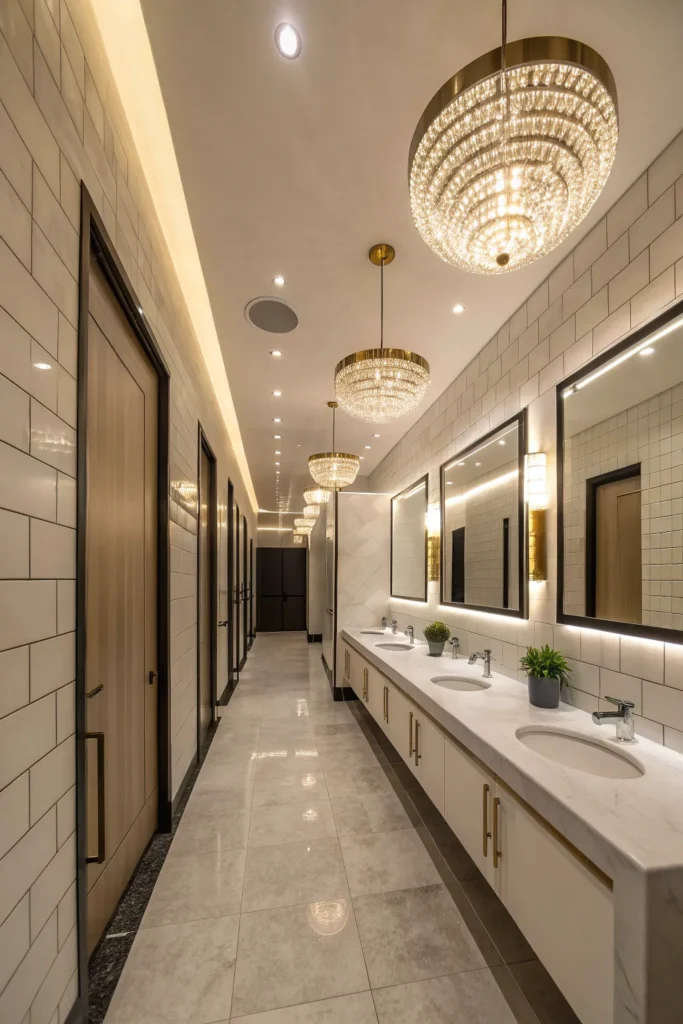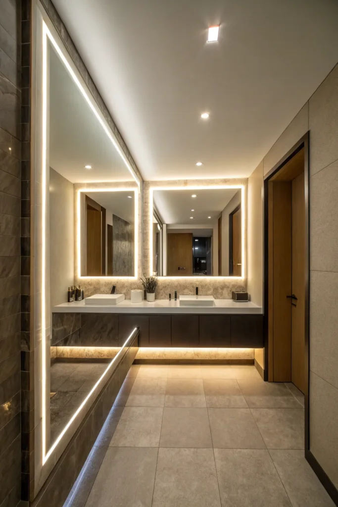 This expands the bathroom visually and distributes light evenly. Pairs especially well with floating vanities and glass-panel showers.