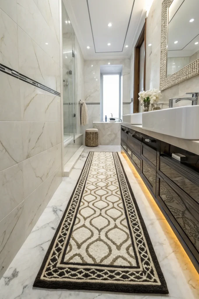 A long patterned runner elongates the bathroom visually and adds warmth to modern finishes. Choose soft neutrals, subtle geometrics, or plush textures.