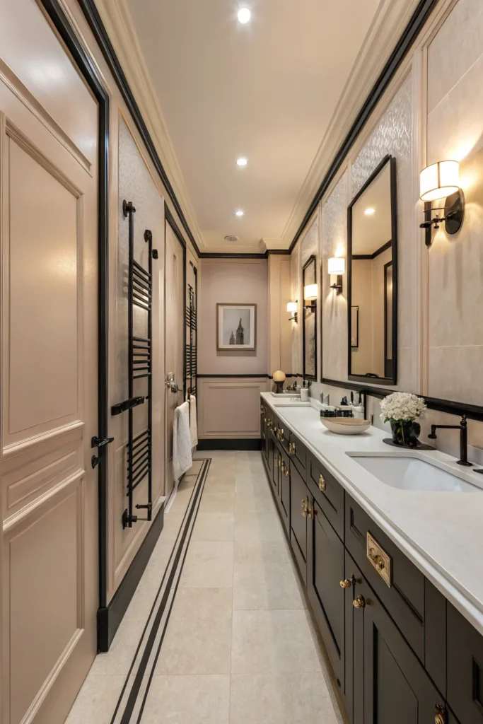 Add slim black lines through fixtures, towel bars, and mirror frames to bring a contemporary edge. Keep decor minimal to avoid cluttering the space.