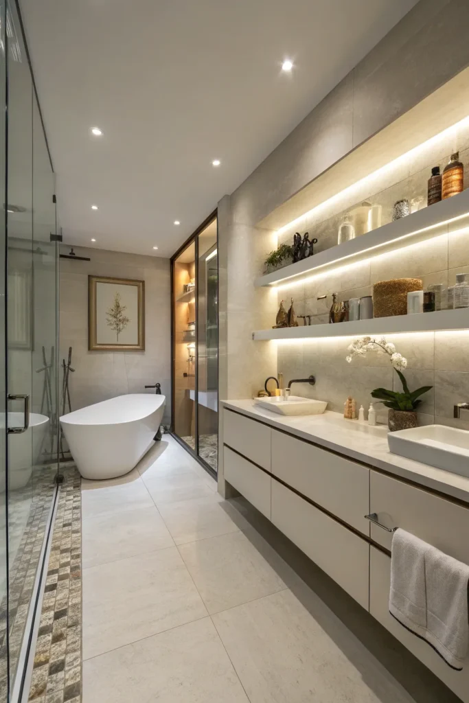 Long and narrow bathrooms can be tricky to design, but with the right layout and smart styling, they can become sleek, functional, and incredibly beautiful. The key is maximizing every inch while keeping the space light, modern, and uncluttered.