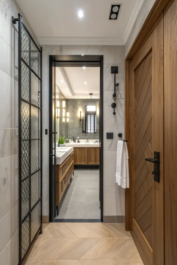 Choose a modern black steel frame or wood finish that matches your bathroom theme. Pocket doors instantly give narrow bathrooms a high-end architectural look.