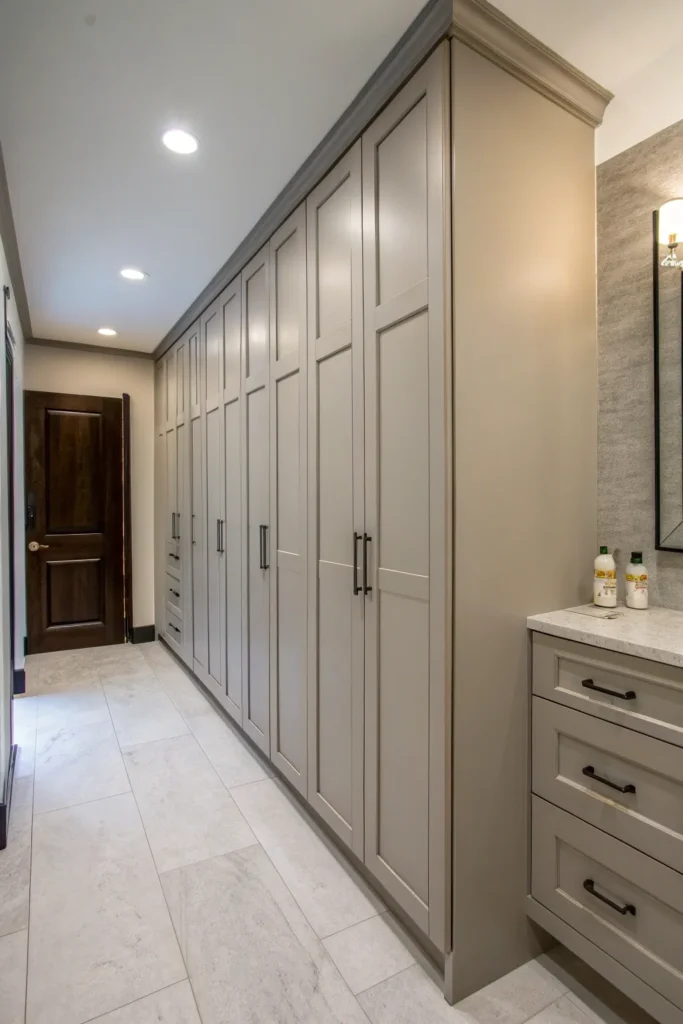 Built-ins look especially refined, but even freestanding slim cabinets can elevate the space. Keep hardware minimal to match the modern aesthetic.