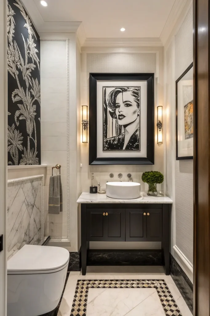 Because the powder room is small, a single piece of artwork can make a significant design impact. Choose modern abstract pieces, black-and-white photography, or bold graphic prints. Art gives the space personality and a gallery-like ambiance that feels chic and well-designed.
