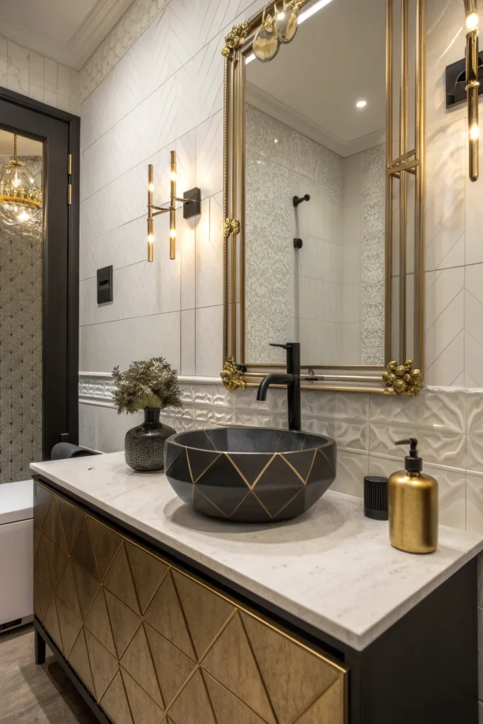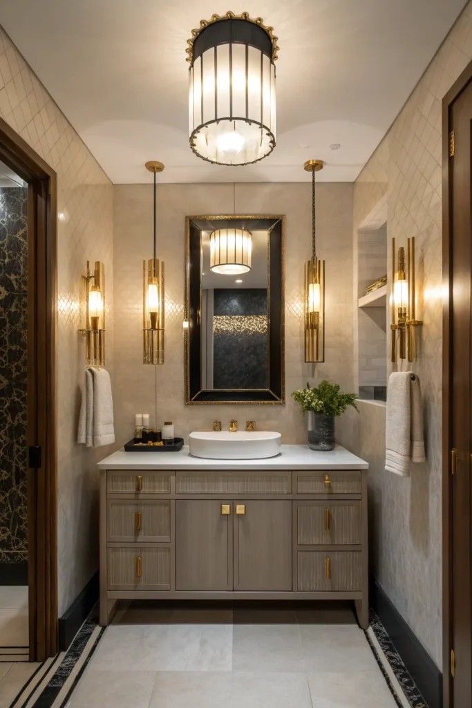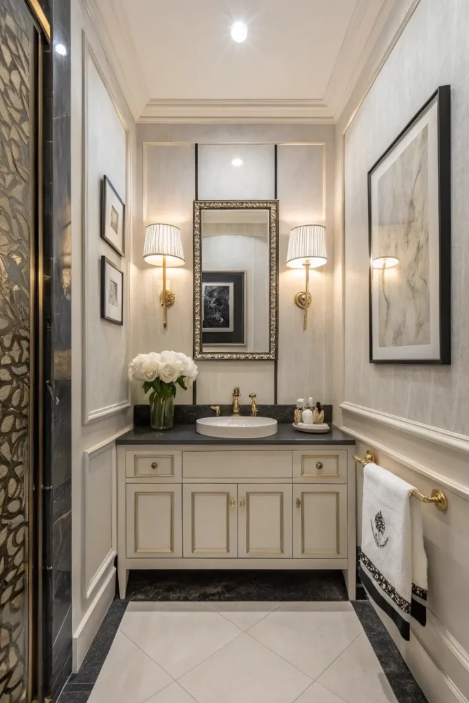 Metallic accents such as gold, brass, and matte black elevate the powder room’s overall aesthetic. These finishes look particularly high-end on faucet handles, towel rings, cabinet pulls, or even light fixtures. Aim for consistency across metals for a cohesive, polished appearance.