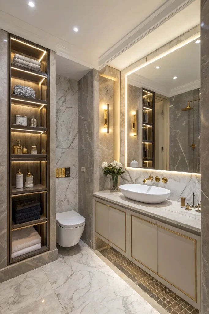 Built-in shelves are a smart solution for small powder rooms. They offer storage while maintaining sleek lines and modern design. Floating shelves in wood, metal, or glass can display towels, candles, or small decor pieces. Just keep the styling minimal to avoid visual clutter.