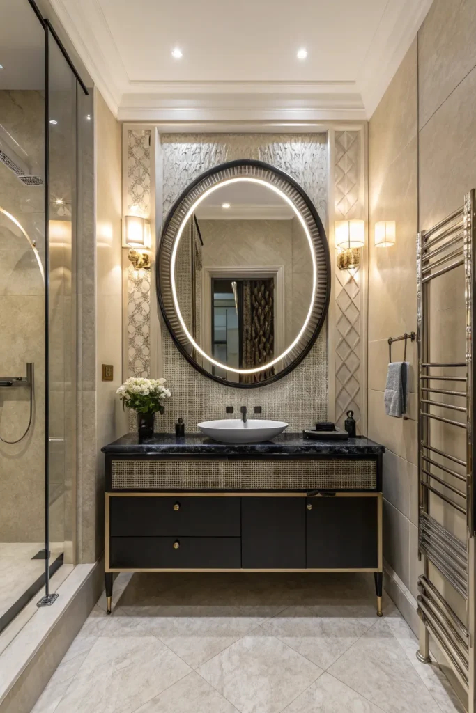 A mirror is one of the most eye-catching elements in a powder room, so choosing the right one can transform the space. Oversized round mirrors, asymmetrical designs, backlit LED mirrors, or geometric shapes can instantly give the room a modern, artistic edge. Opt for mirrors with metal or matte black frames for a polished finish.