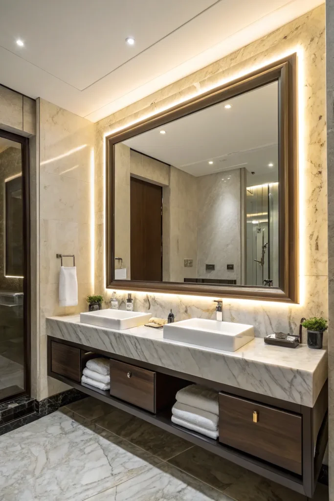 A backlit mirror adds a soft glow that feels modern and luxurious. The diffused light enhances the atmosphere and removes harsh shadows, which is perfect for small rooms. It’s a functional yet stylish feature that instantly elevates the decor and creates a spa-like vibe in the powder room.