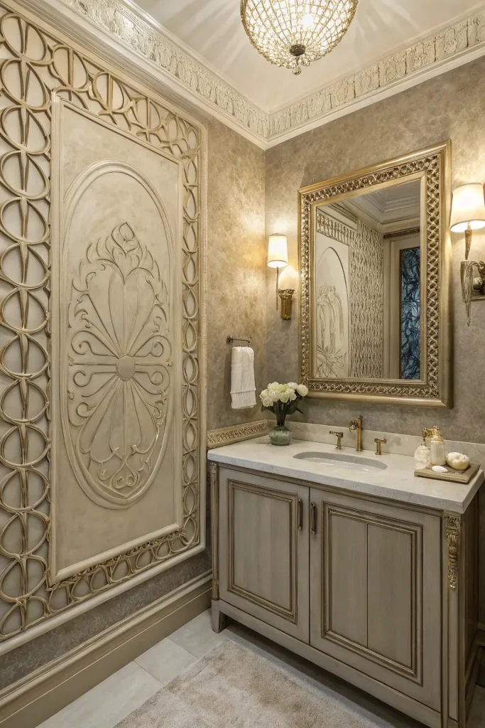 Textured wall designs—such as Venetian plaster, fluted panels, or 3D tiles—create dimension and visual interest. These textures can turn a simple powder room into a stunning architectural space. Choose subtle tones like taupe, cream, or muted greys for a modern, sophisticated look that blends style with elegance.
