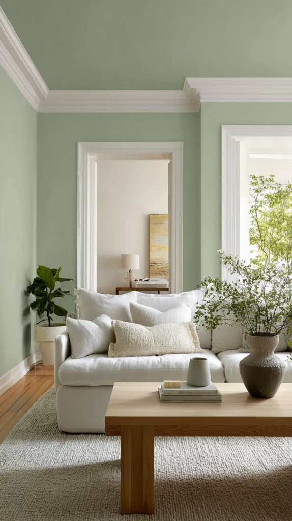 Style tip: Paint the ceiling in the same sage green as the walls if the room has good natural light and generous ceiling height. An all-over sage room — walls and ceiling in the same tone — creates an enveloping, forest-like quality that accent walls cannot approach. In lower-ceilinged or darker rooms, keep the ceiling white to maintain brightness and reserve the sage for the walls only.