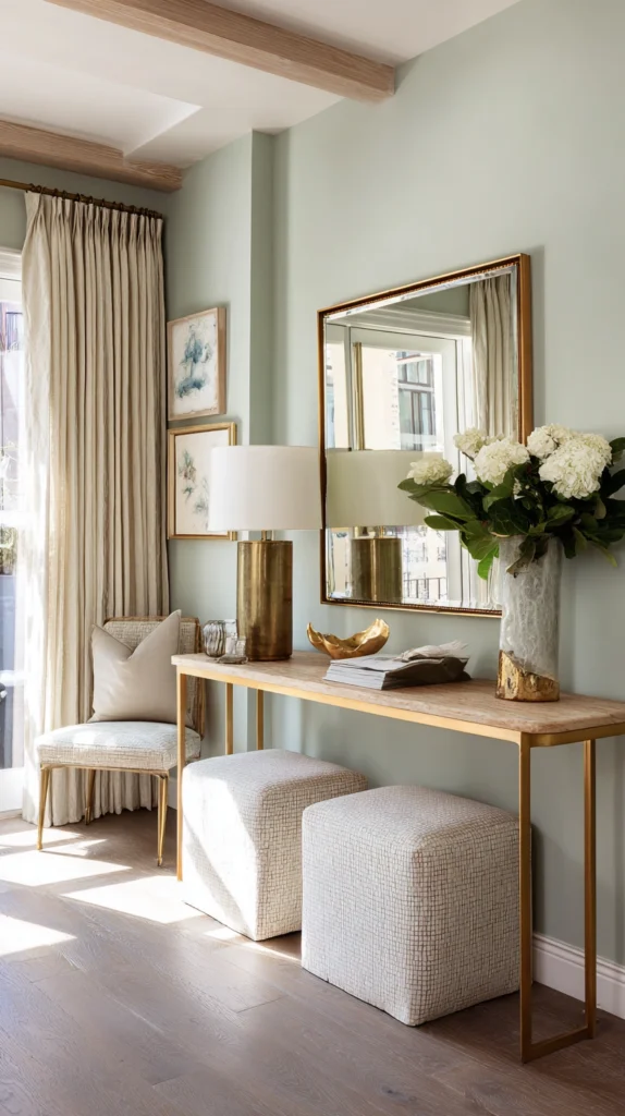 Brass or aged brass hardware — picture hooks, light switch plates, curtain poles, and mirror frames — against sage green walls creates one of the most specifically modern and most enduringly satisfying material combinations available in a living room. The warmth of brass against the cool botanicality of sage is the colour-material equivalent of the sage and terracotta palette — each making the other more effective by contrast.