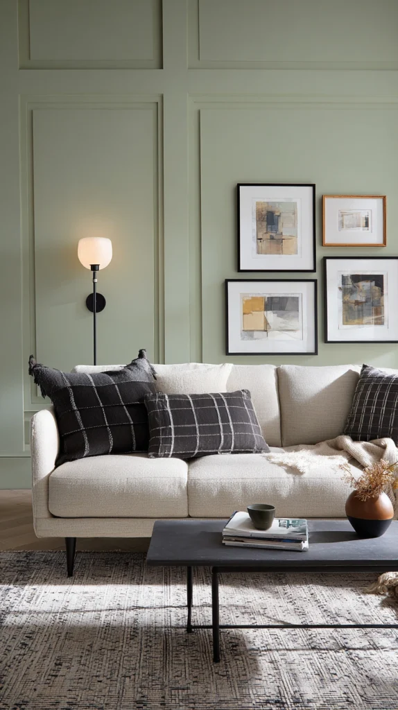 The combination of sage green and black — in picture frames, furniture legs, light fittings, and architectural details — creates the most contemporary and most graphic version of the sage green living room. The black sharpens the softness of the sage and gives the room a crispness and definition that sage alone, in its inherent quietness, does not always produce.