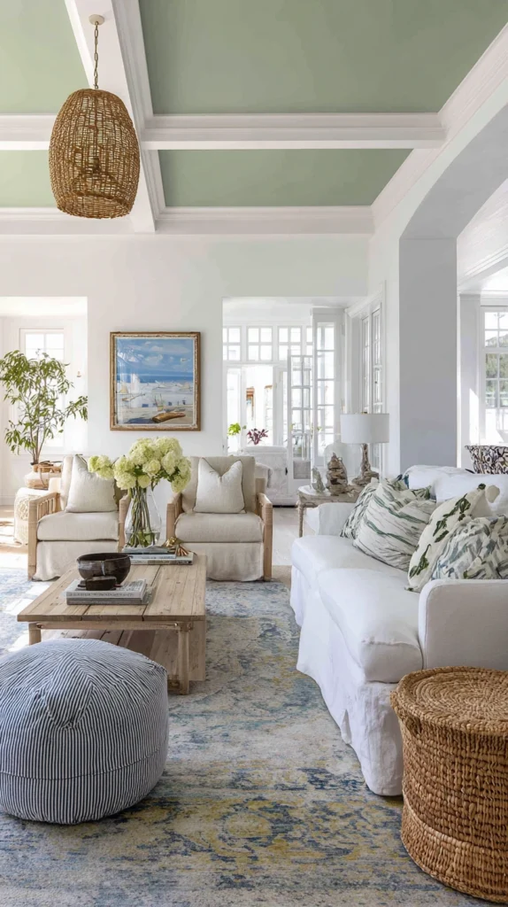 Painting only the ceiling in sage green — with all four walls remaining white — creates an unexpected, modern, and deeply atmospheric living room that most people have not seen before and that produces an almost immediate positive reaction from guests who enter it. The coloured ceiling lowers the apparent height of the room in a way that feels intimate rather than oppressive and creates a canopy-like quality that is uniquely restful.