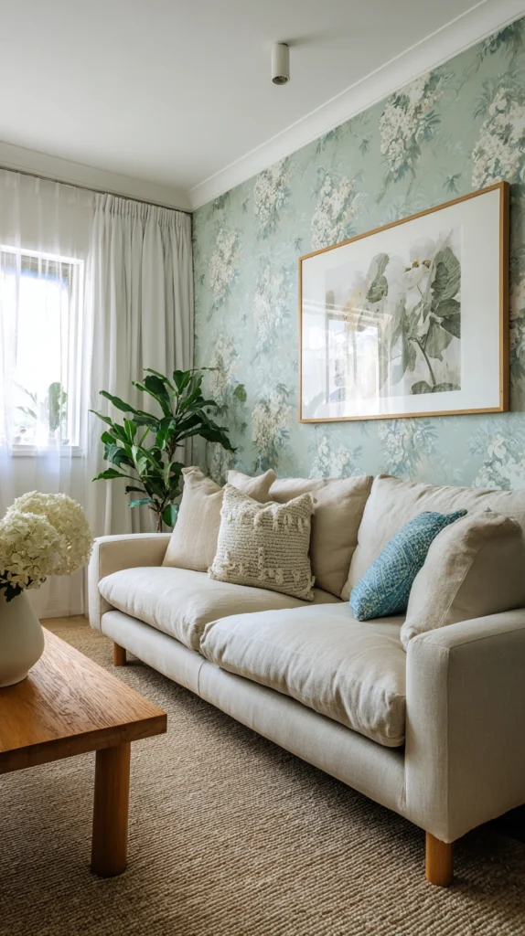 A sage green botanical wallpaper — large-leafed ferns, delicate botanical illustrations, or a tone-on-tone leaf print — used on one or all four walls creates the richest and most layered version of the sage green living room, adding pattern and depth to the colour that paint alone cannot achieve. On a single feature wall it provides sufficient botanical richness to anchor the whole room without overwhelming it.