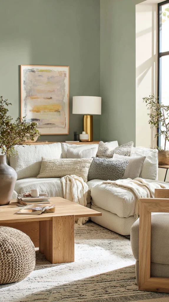 Sage green walls combined with natural, undyed linen upholstery, pale oak or ash wood furniture, and jute or seagrass floor rugs creates the most naturalistic and most consistently beautiful modern sage green living room palette. Every material in the room references the same organic, earthy, botanical quality as the sage on the walls.