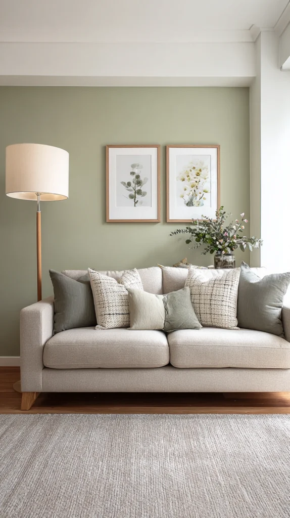 A litre of sage paint covers a standard sofa wall in two coats — most walls require 1.5–2 litres at $15–$35 per litre. The feature wall approach works best when the sofa itself and the objects around it are relatively simple — a sage wall behind an already-busy arrangement of furniture and art can feel congested rather than considered.