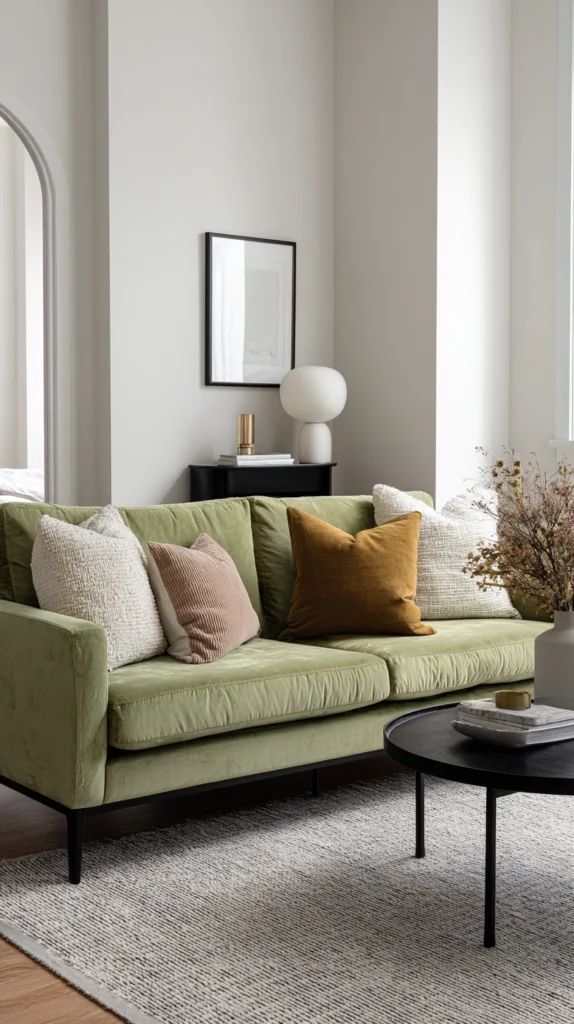 Style tip: Pair a sage green velvet sofa with cushions in warm neutral tones — terracotta, warm cream, and dusty rose — rather than in cooler blues or greys that can make the combination feel studied. The contrast between the cool sage and a single warm accent tone creates the most visually interesting and most liveable colour tension available within this palette.