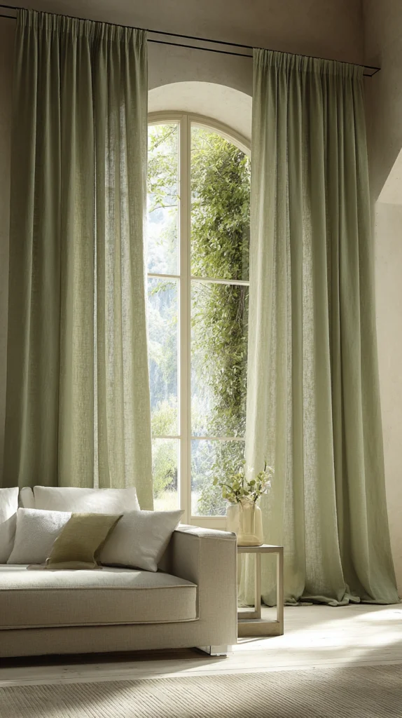 Sage green linen curtains — hung at ceiling height and pooling very slightly on the floor — are the most atmospheric way to bring the colour into a living room through a textile rather than a paint or upholstery decision. They filter natural light as a warm, slightly green-tinted quality that shifts the colour temperature of the whole room toward the natural, organic quality that sage green is best at creating.