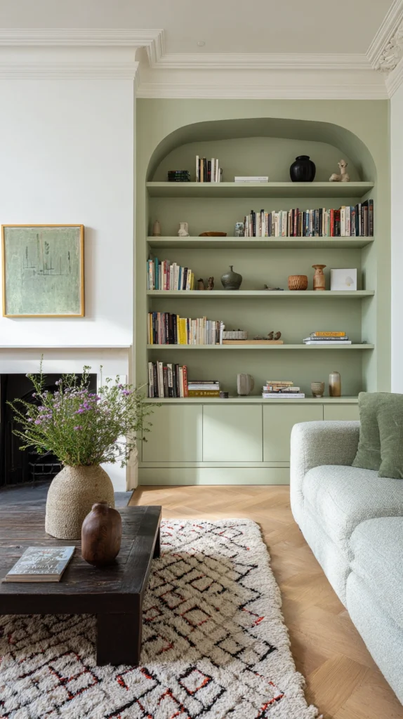 Built-in shelving alcoves painted in sage green — while the rest of the room remains white — create one of the most sophisticated and most specifically modern applications of the colour in a living room. The sage recedes within the alcove and makes the objects displayed on the shelves — books, ceramics, plants — appear to float against a coloured background rather than sitting on a shelf in front of a white wall.