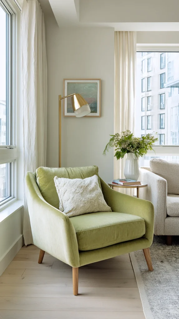 A single sage green accent chair in a neutral living room — placed beside a floor lamp, angled slightly toward the main sofa — brings the colour into the room as a considered accent rather than a dominant decision. It introduces sage without committing the whole room to it and provides a clear, deliberate colour relationship between the chair and whatever other sage tones appear in the room.