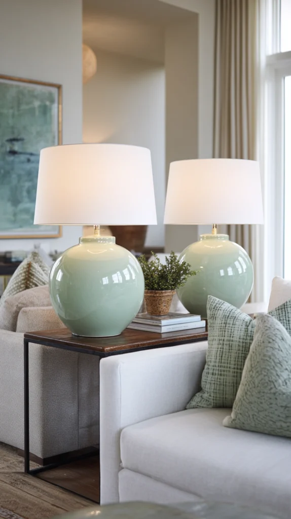 A pair of sage green ceramic lamp bases on side tables or console surfaces introduces the colour at the most atmospheric level — below eye height, casting warm light upward from a surface that the eye naturally rests on during an evening in the room. It is the smallest and least committed sage green addition on this list and one of the most consistently effective.