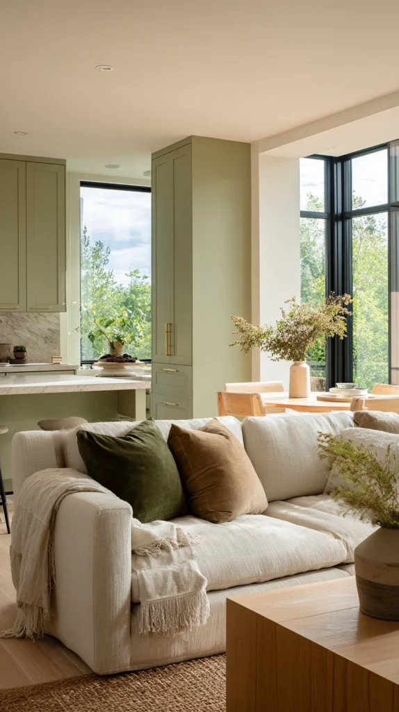 In open-plan spaces where the kitchen and living room are visible from each other, running the sage green through both spaces — on living room walls and on kitchen cabinet fronts — creates a visual thread that connects the two zones and makes the combined space feel designed as a whole rather than decorated in separate rooms that happen to share a floor.