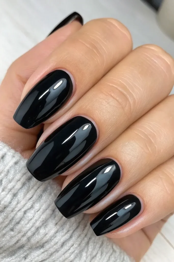 The black glossy manicure is the definition of sophistication. Sleek, reflective, and bold — it commands attention without saying a word. A smooth application and a high-shine top coat make this style stand out.