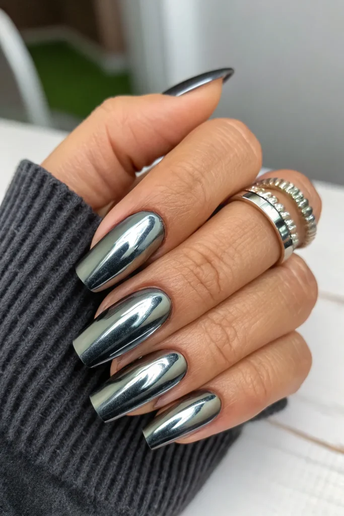 A metallic grey or black chrome finish gives a futuristic edge to your manicure. The reflective shine adds depth and gives the illusion of liquid metal — strong, bold, and mesmerizing.