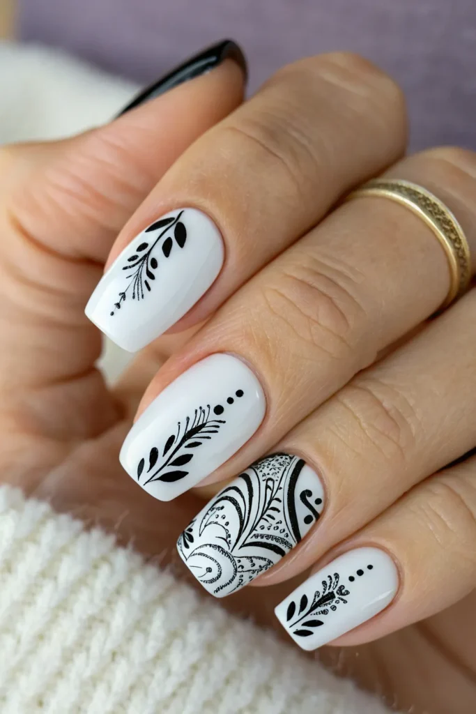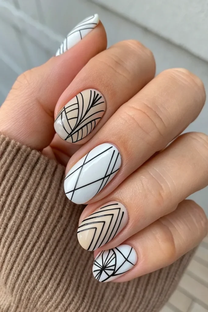 White or nude nails with fine black line drawings create a minimalist, artsy effect. The designs can resemble faces, shapes, or modern art sketches — elegant yet creative.
