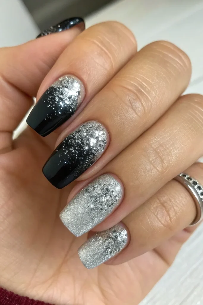 For a touch of glamour, fade silver glitter from the base of your black nails outward. The sparkle looks like a night sky full of stars, giving your monochrome manicure a celestial vibe.