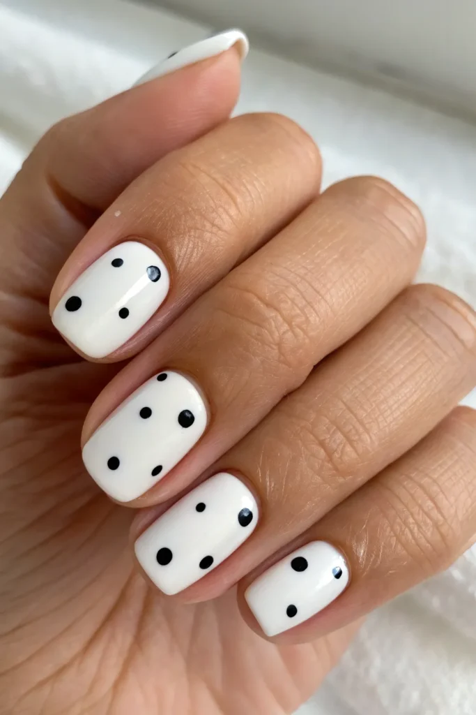 Minimalist dots are a perfect way to keep things sleek yet playful. Start with a crisp white base and add tiny black dots — either centered or near the cuticle — for balance.