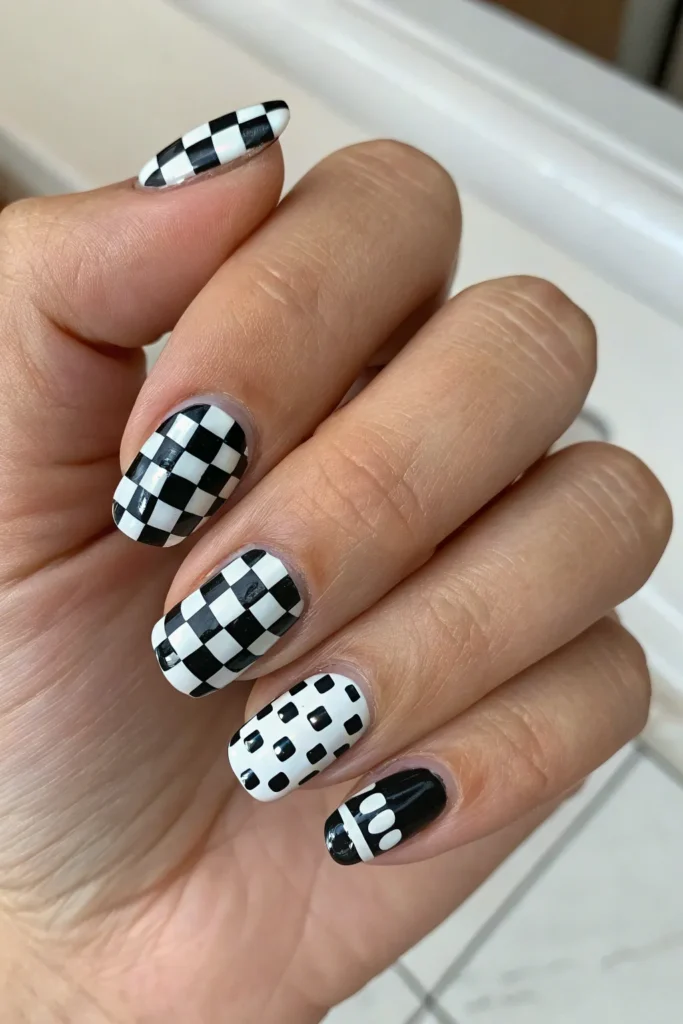 Checkerboard nails bring playful energy to the monochrome palette. Alternating black and white squares create a retro yet trendy look that feels very 2025-chic.
