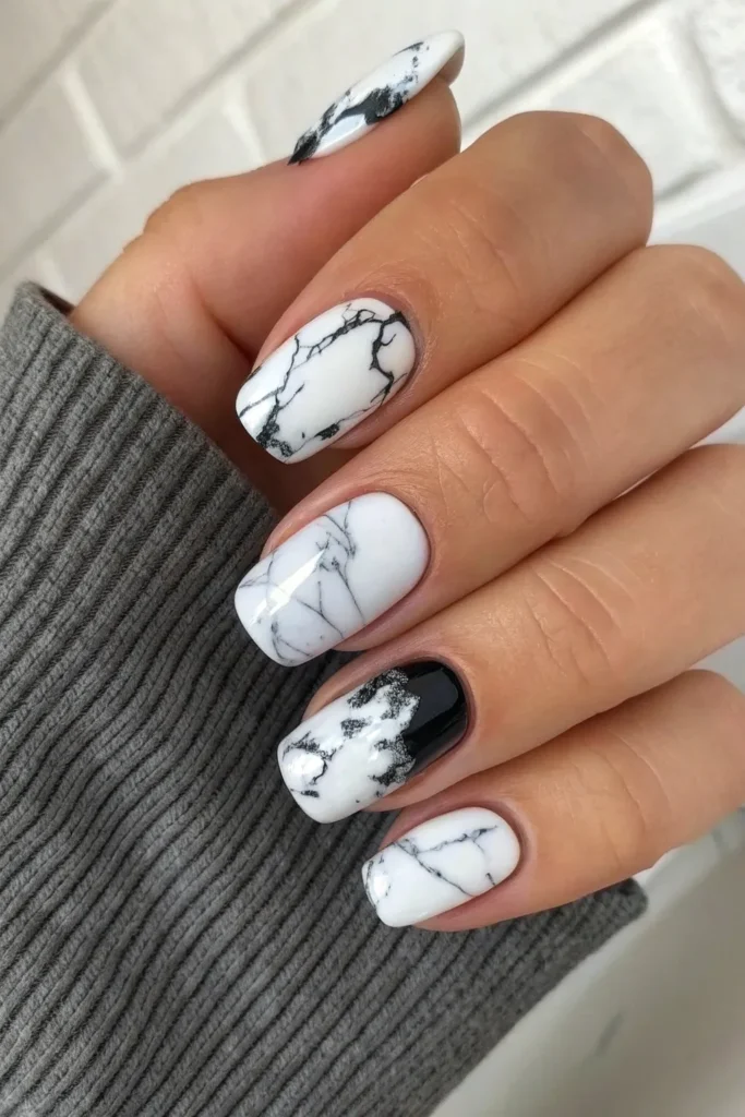 Black, grey, and white swirls combine to create a marbleized effect that looks high-end and artistic. No two nails are exactly alike, which makes this style unique and luxurious.