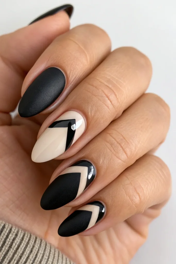 Mixing black and white in sharp geometric patterns creates a monochrome masterpiece. Use clean lines, triangles, or asymmetric shapes for a high-contrast, graphic effect that feels editorial.