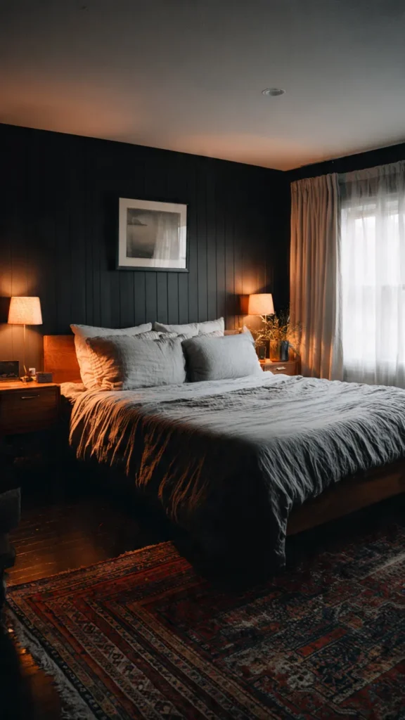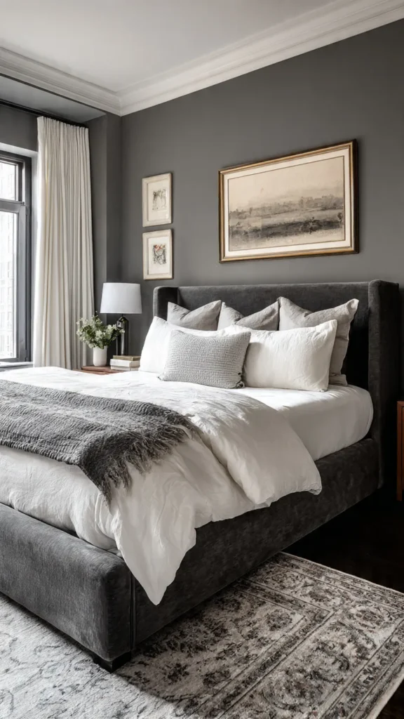 To keep charcoal from feeling too heavy, pair it with soft white accents on bedding, trim, or ceiling details. Crisp white sheets, a plush ivory rug, or simple white curtains provide contrast that keeps the room fresh and breathable while maintaining a sophisticated, moody edge.