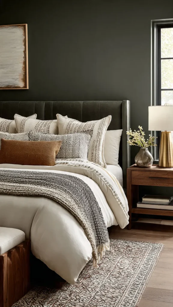 Pair olive with cream, warm wood, and subtle metallic accents for a balanced look. The combination creates a space that feels both timeless and on-trend, perfect for a sophisticated modern bedroom.