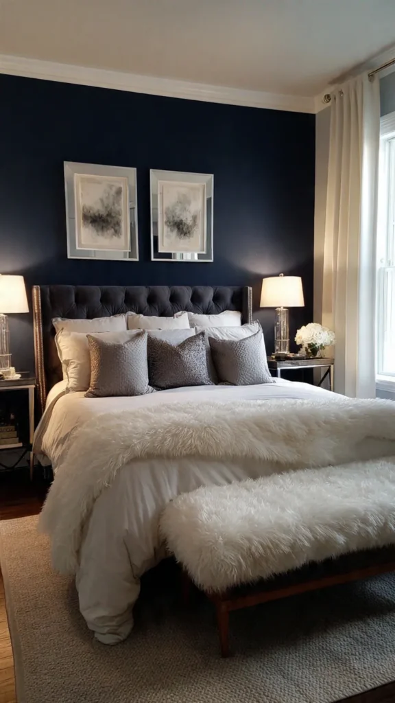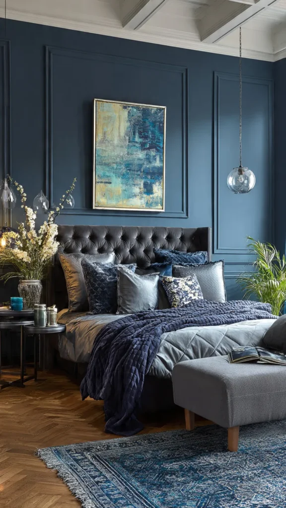 Pair midnight blue with silver or chrome accents for a sleek, contemporary feel. Soft white or gray textiles lighten the look and keep the bedroom feeling balanced, resulting in a sophisticated and stylish retreat.