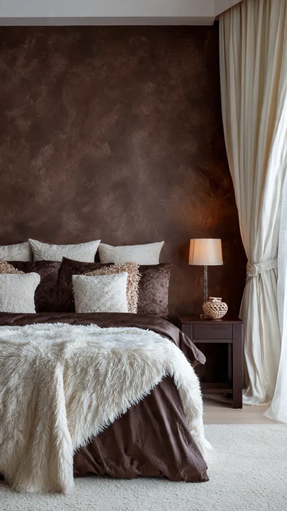 Cream accents in bedding, curtains, or rugs lighten the look and prevent it from feeling too heavy. The contrast between dark brown and soft cream creates a balanced, elegant space that feels both luxurious and restful.