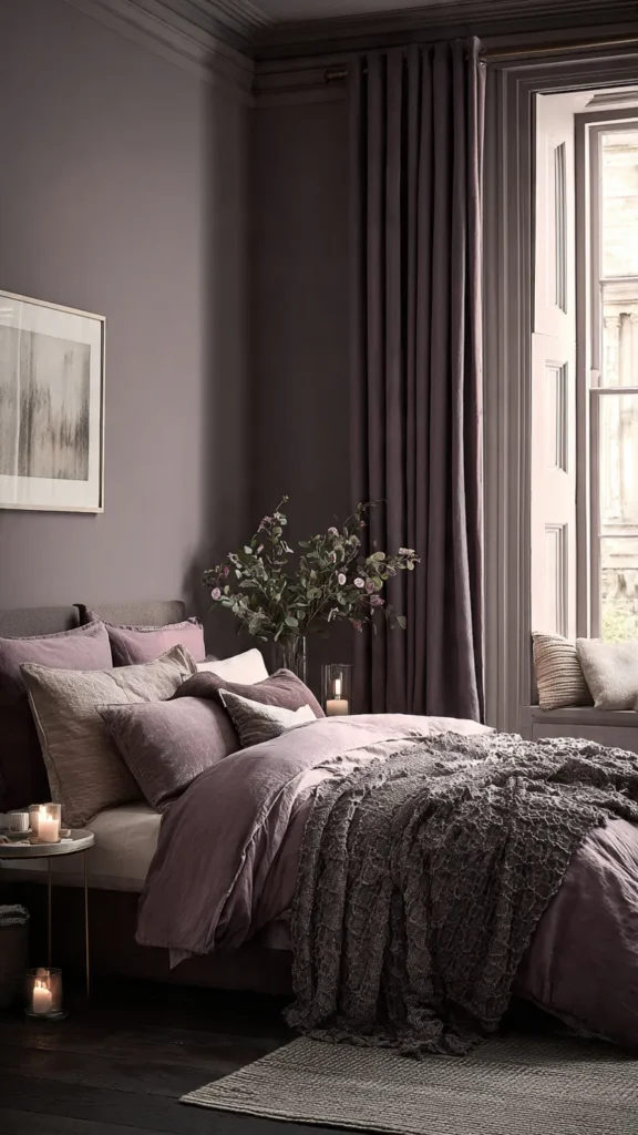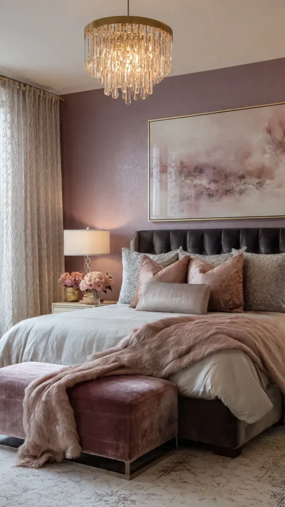 Pair mauve with gray, beige, or metallic accents to enhance its elegance. Layered fabrics and gentle lighting complete the look, creating a bedroom that feels intimate, cozy, and sophisticated.