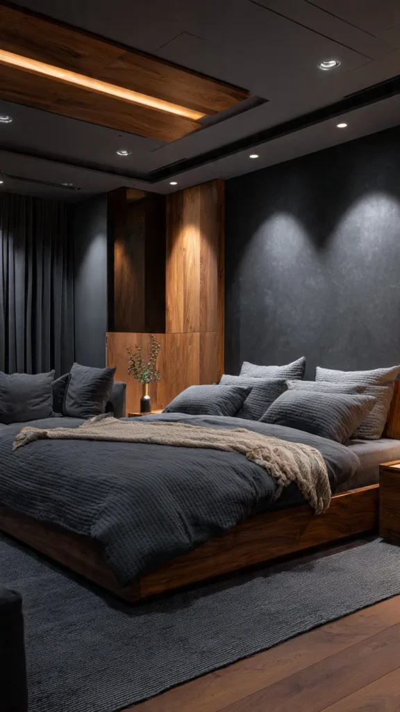 Balance graphite gray with warm wood tones, soft textiles, and ambient lighting to soften its coolness. This combination keeps the space from feeling cold while maintaining a strong modern aesthetic.