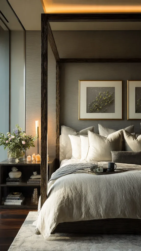 Layer taupe with darker accents like charcoal or espresso for added depth. Soft lighting and plush textiles enhance its warmth, resulting in a bedroom that feels serene, elegant, and comfortable.