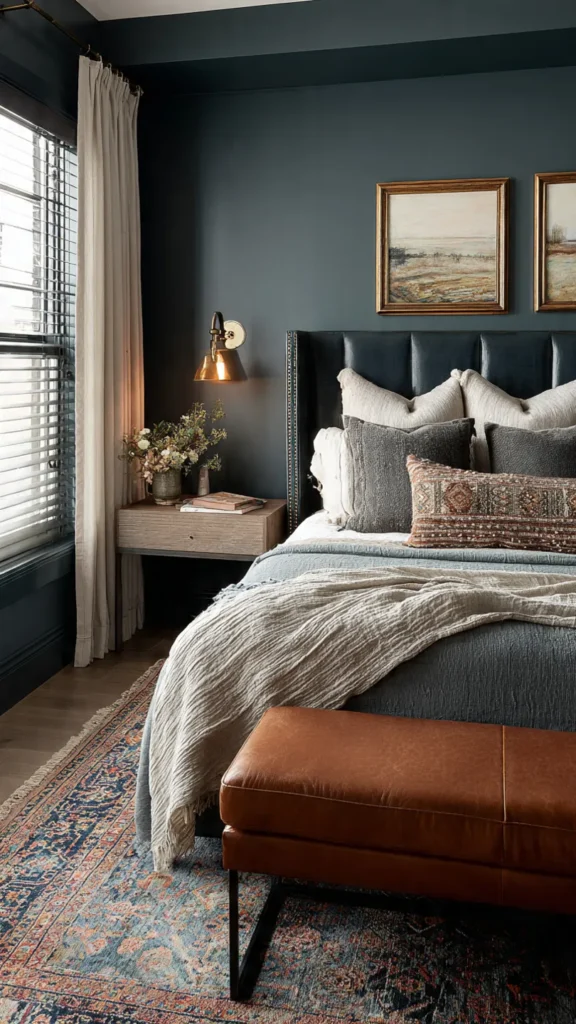 Pair dark teal with warm metals, soft neutrals, and natural textures to keep the space balanced. This combination creates a bedroom that feels artistic, modern, and deeply inviting.