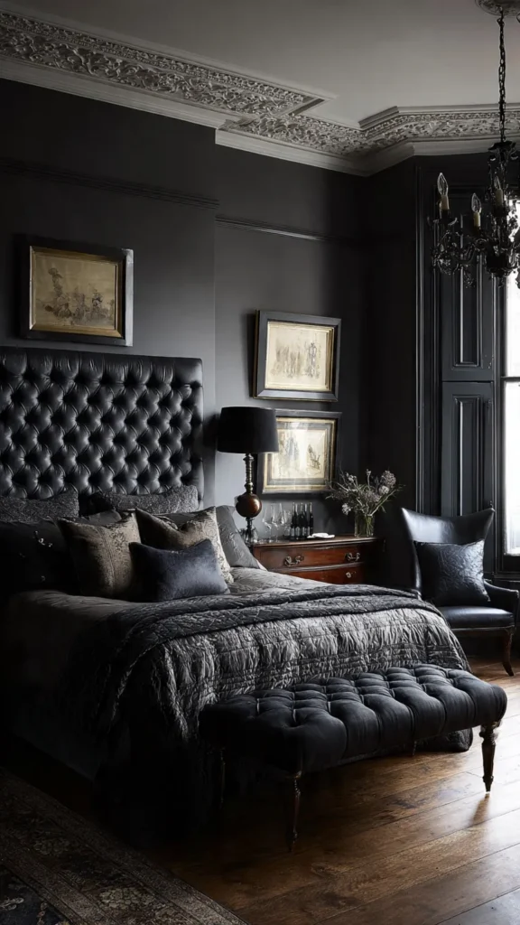 Balance black walls with lighter bedding, warm wood furniture, and soft lighting to avoid an overly stark atmosphere. Adding reflective surfaces like mirrors or metallic decor helps bounce light around the room and keeps the space feeling dynamic and stylish.