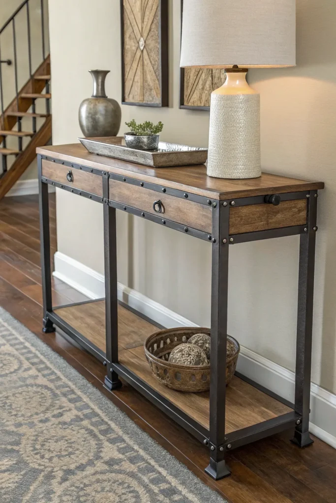Style with simple accents like a metal tray or neutral lamp. Avoid over-decorating to maintain the raw appeal. This look adds character to small entryways.