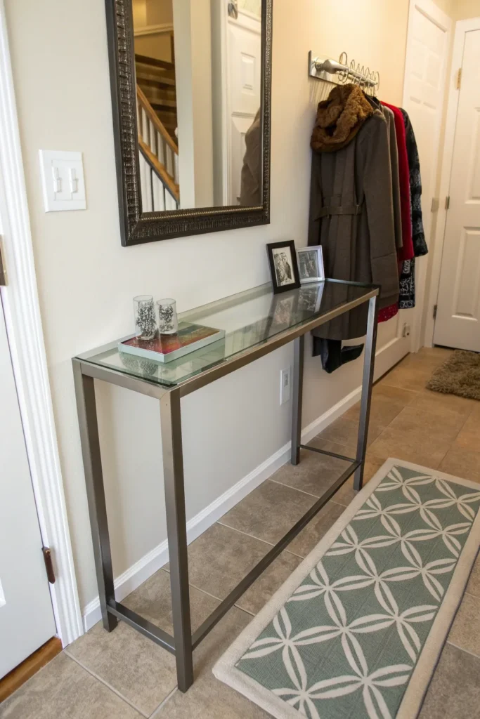Glass-top consoles are excellent for visually expanding small entryways. The transparency allows light to pass through, making the space feel larger. A slim metal or wood base grounds the design.