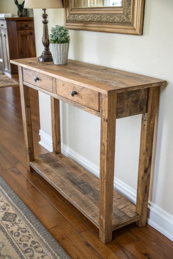A narrow rustic console brings charm and texture to compact entryways. Reclaimed or distressed wood adds depth without overwhelming the space. The slim profile keeps it functional yet cozy.