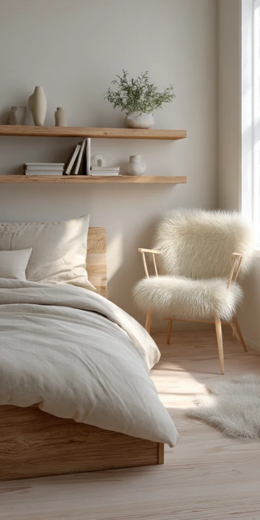 Add stone elements through small decorative pieces—perhaps a smooth river rock collection on your nightstand or a marble tray for jewelry. Keep walls white or in soft neutral tones to maximize natural light reflection. The key to this aesthetic is restraint: every piece should have purpose, and empty space is just as valuable as filled space. A single sheepskin rug draped over a simple wooden chair adds warmth without cluttering the visual landscape.