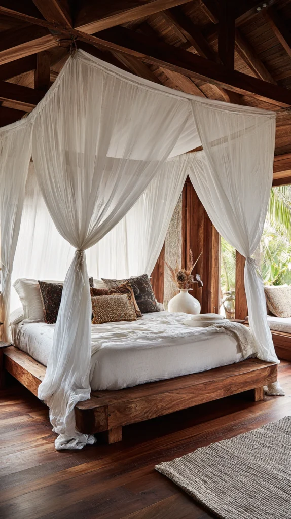 Create an elevated, tropical-inspired retreat using bamboo, teak, and natural stone. Choose furniture in warm tropical woods with visible grain and rich color. A canopy bed frame made from bamboo or teak posts draped with sheer linen curtains creates instant tropical romance while maintaining the natural material palette.