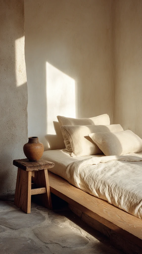 Keep walls bare or painted in pure white or pale stone colors. A small wooden stool serves as a nightstand. One small window with a simple linen panel provides privacy while admitting light. The room should feel peaceful, uncluttered, and focused on essentials—a true retreat from the overstimulated modern world.